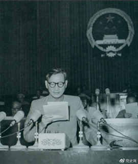 ▲1955年7月,陳云在一屆全國人大二次會議上作堅(jiān)持和改進(jìn)糧食統(tǒng)購統(tǒng)銷工作的報(bào)告。